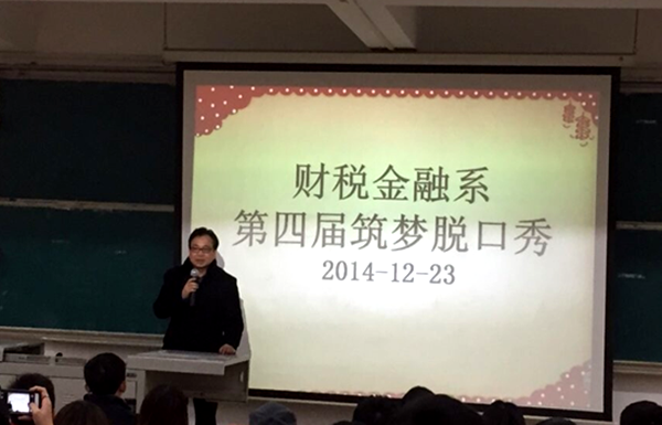 12月23日晚7时,财税金融系第四届筑梦脱口秀比赛在综阶五教室举行。财税金融系主任樊纪明、本科部负责人刘双红、建筑工程管理教研室老师担任评委。14级建筑工程管理、工程造价专业员工参加此次比赛。